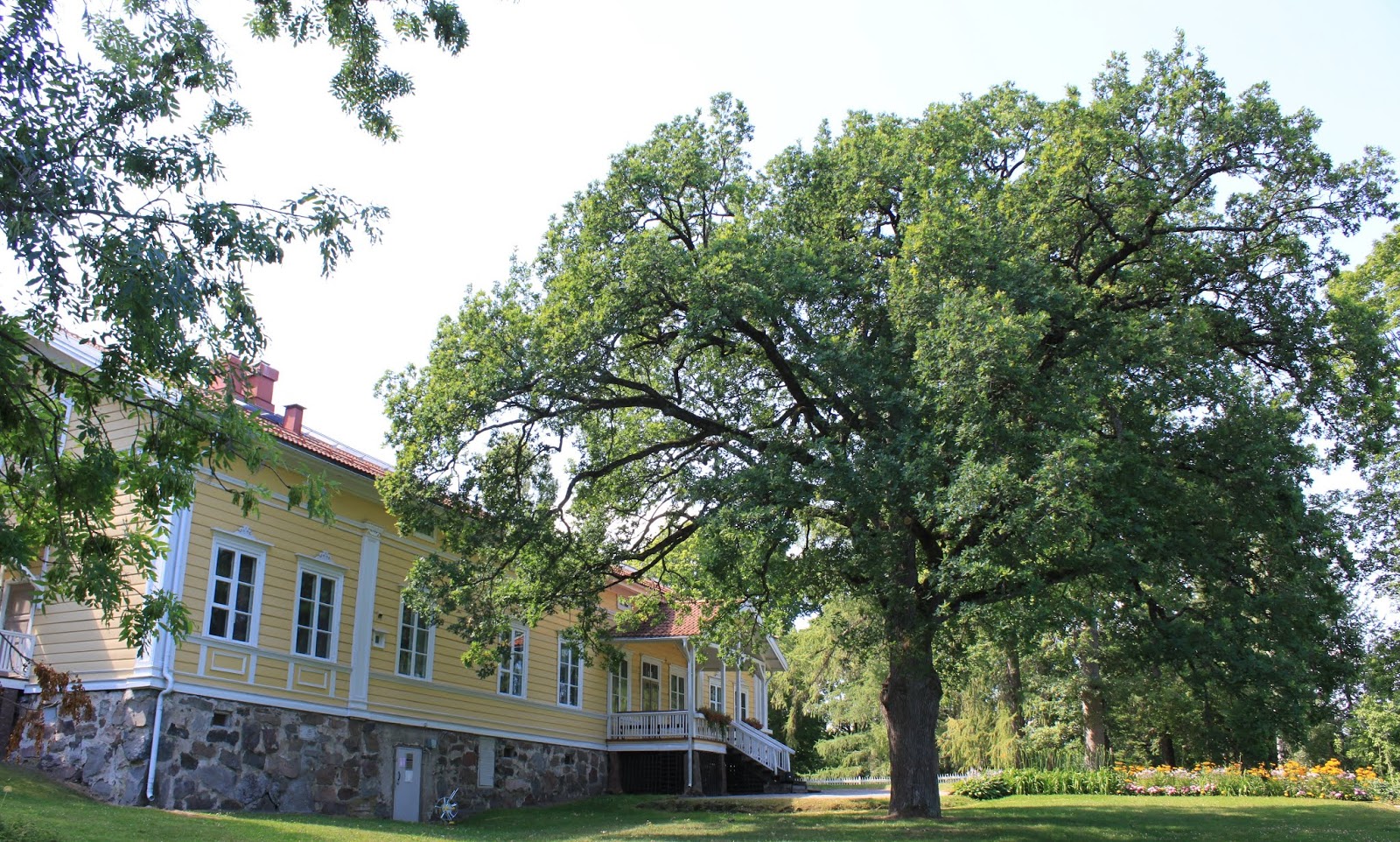| Päärakennuksen takana on upea puutarha ja komea vanha tammi |