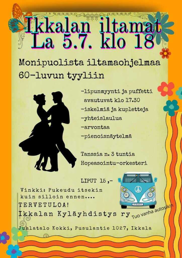 Ikkalan kyläyhdistys ry järjestää Ikkalan iltamat 60-luvun teemalla lauantaina 5.7. 2024 klo 18 Juhlatalo Kokin vanhassa navetassa (osoite: Pusulantie 1027, Ikkala).