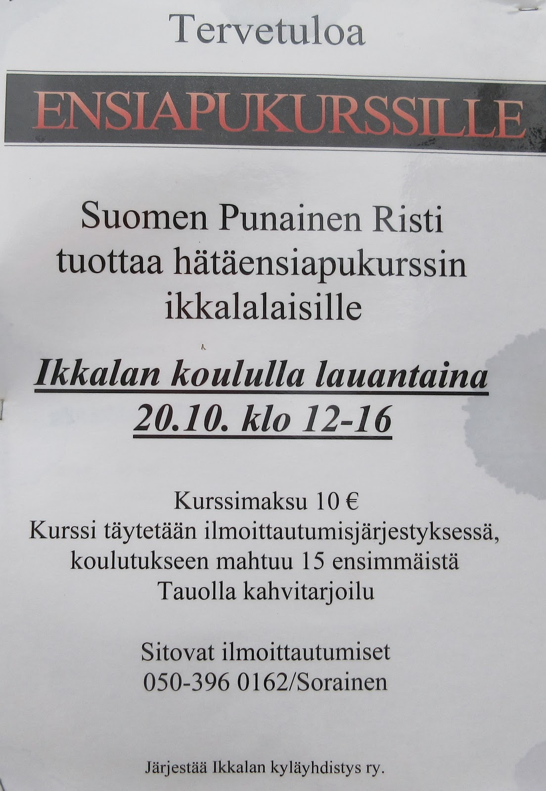 Ikkalan kyläyhdistys järjestää lauantaina 20.10 klo 12-16 Ikkalan koululla hätäensiapukurssin. Koulutuksen tuottaa
