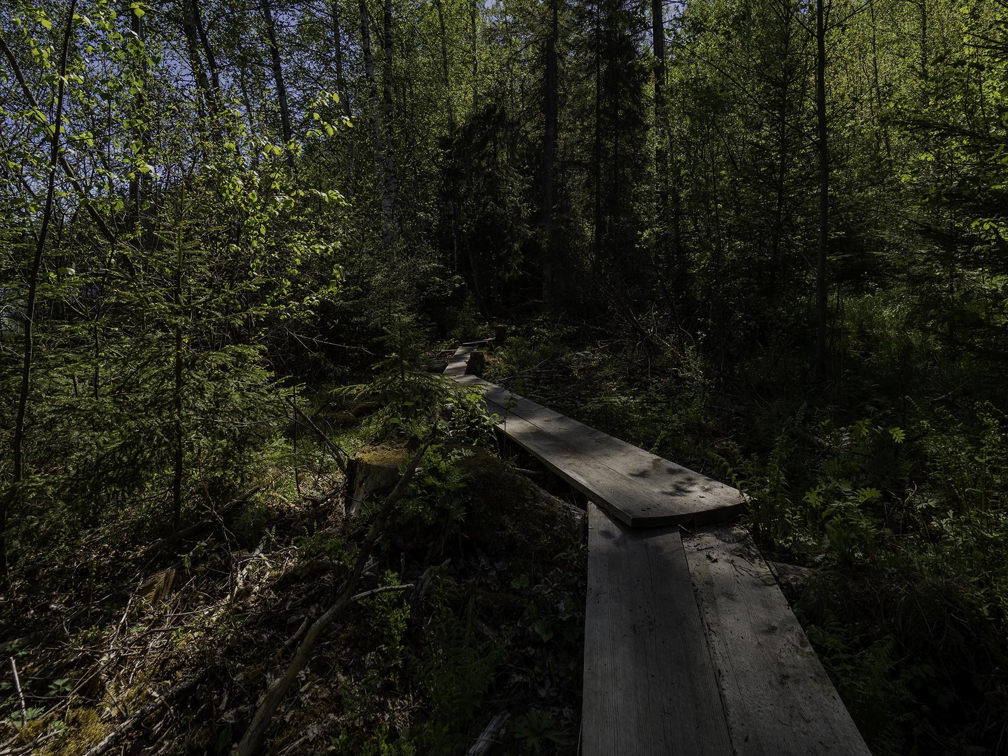 pitkospuut ja parin ojan yli sillat. Polun loppupää sai katteeksi
