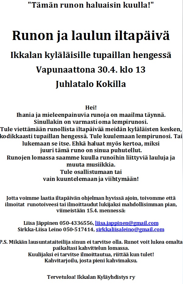 Ikkalan kyläyhdistys järjestää vapunaattona 30.4. Runon ja laulun iltapäivän klo 13. Paikkana on Juhlatalo Kokki.